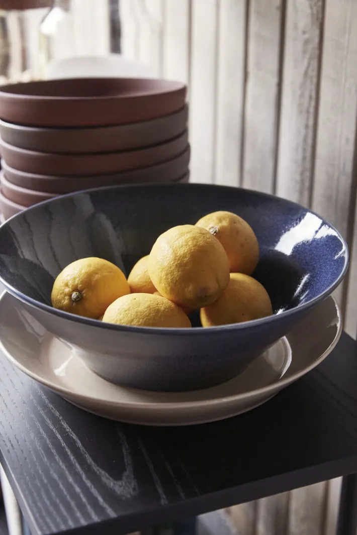 The bowl is made from ceramics and comes in a deep blue. The bowl can be used for serving food, such as salads or snacks, or to display interior and decorations. This product is handmade and may therefore variate.