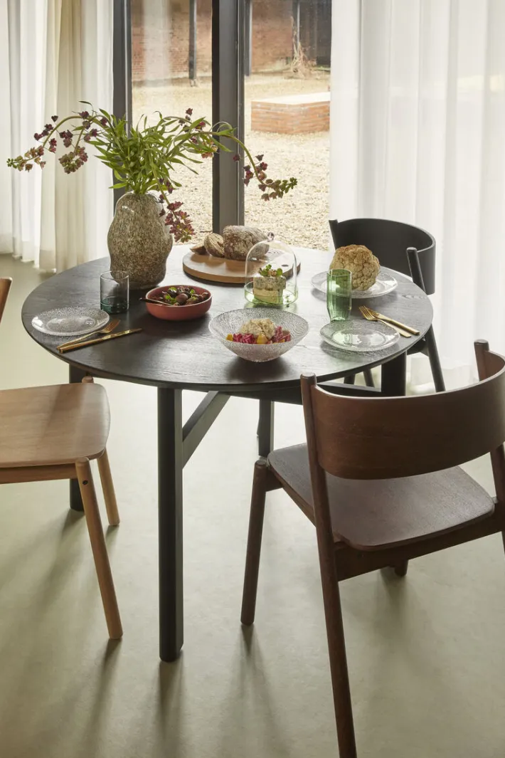 This wonderful dining chair takes its blueprint from Danish design traditions, and we are in love! The warmth of the wood adds softness to the minimalist and classic form, where the signature diagonal line is an extension of the rear legs. Hence the name Oblique. A contrasting curved backrest creates a remarkable and comfortable feature, allowing maximum support even after prolonged sitting. This one is a keeper; Not only does this chair stack it also flat-packs—FSC-certified wood, but yes, of course. The Oblique Dining Chair in black lacquered oak wood will be loved generation after generation.